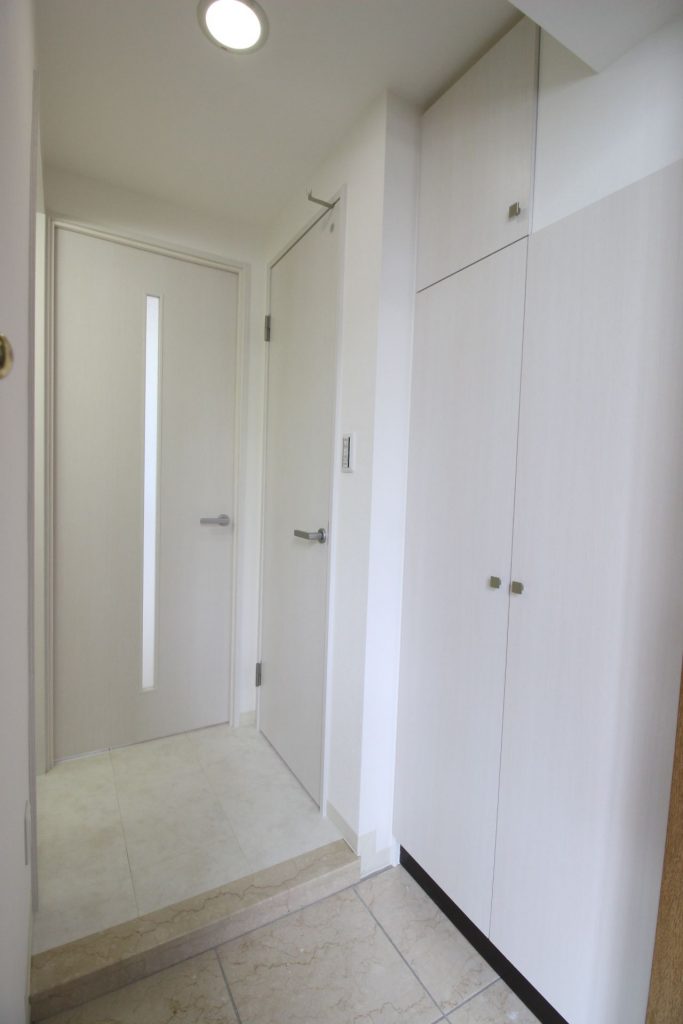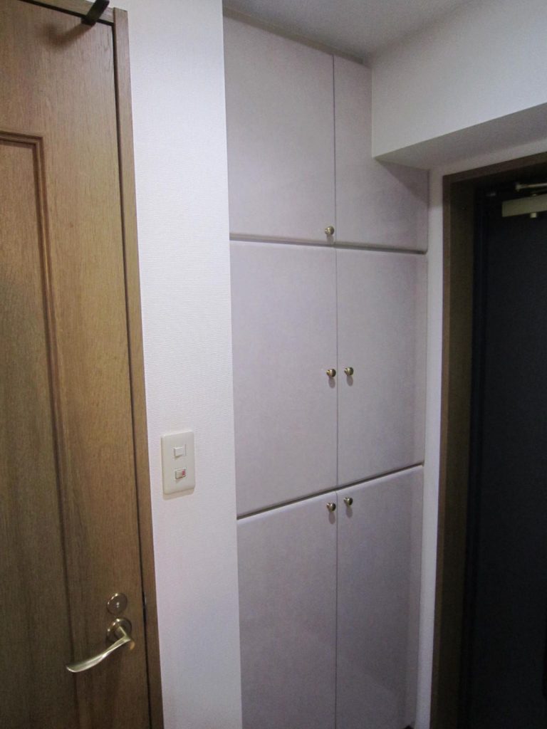 玄関収納は、他の建具に合わせて造作で扉を造り替え、明るい玄関になりました。