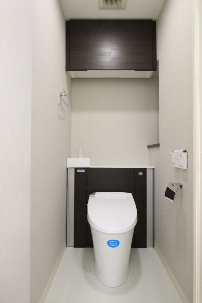 トイレだけは、アクセントにダーク色を。背面がちょっとした収納になっているタンクレス風のトイレ。