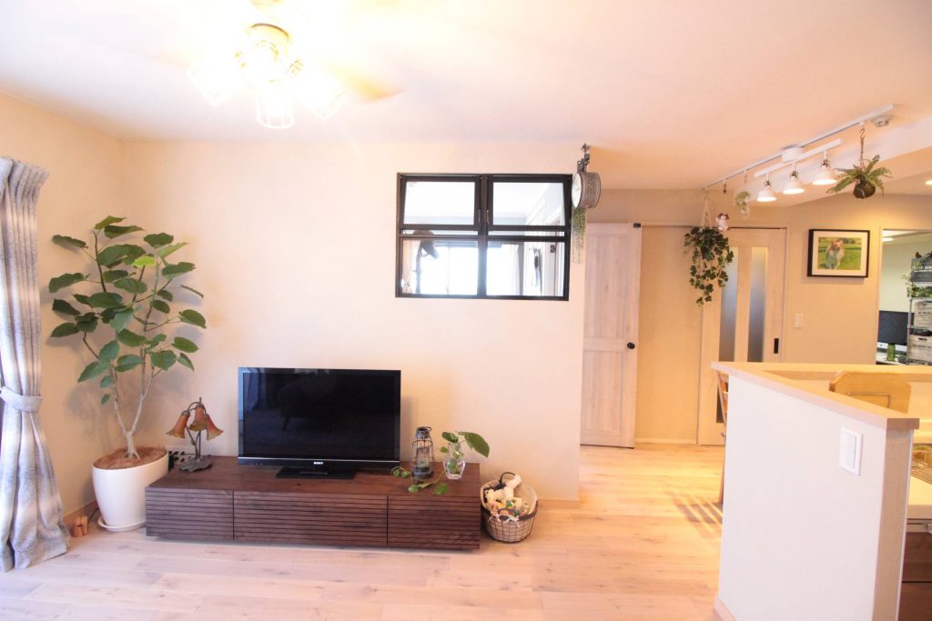 角部屋であるものの、リビングには、大きな掃き出し窓が一つの間取りですが、室内窓を設けることで寝室側の窓からの明るさを採り入れることができ、明るいリビングに。