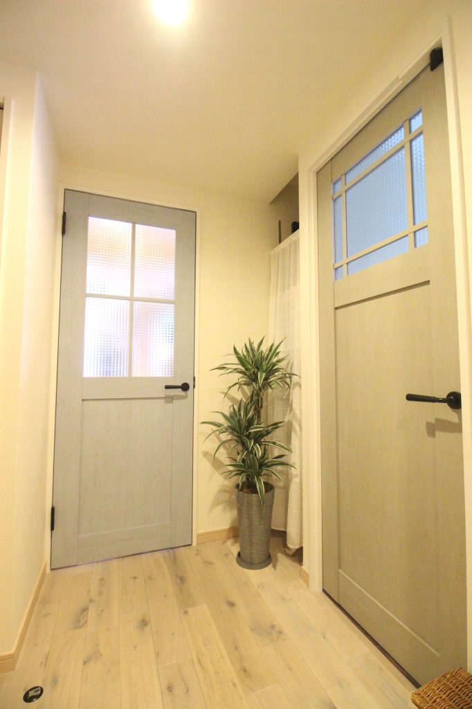 キッチン正面のガラス入り引戸は、W.I.C.の入口です。