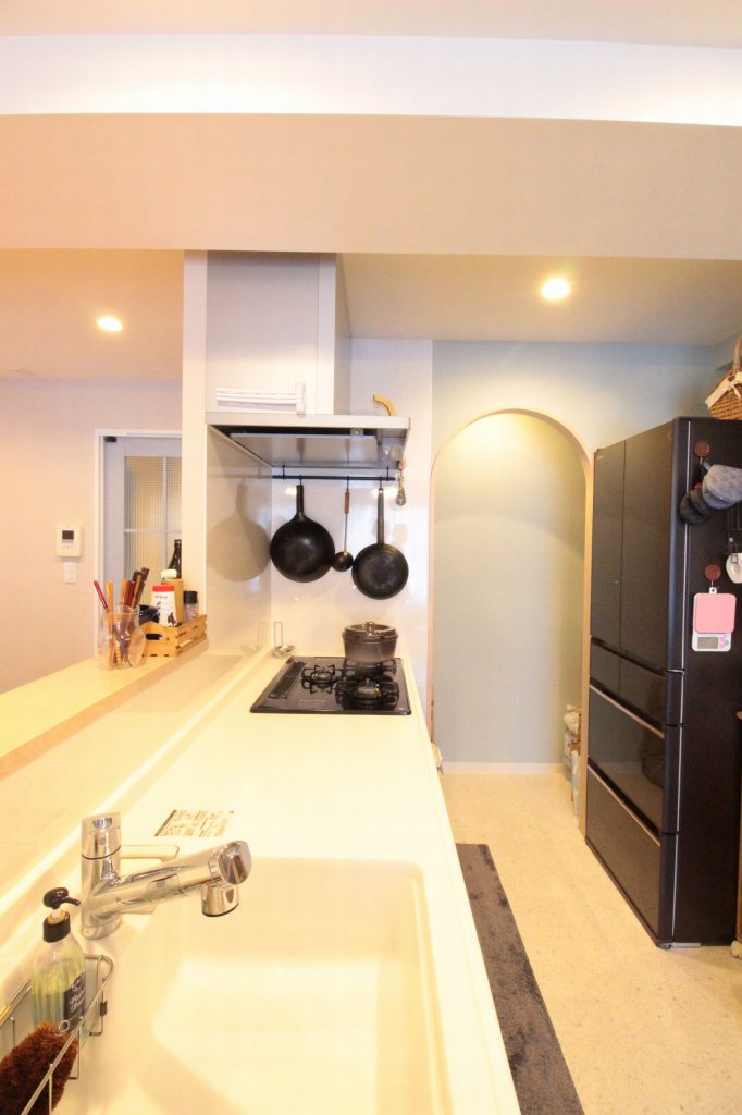 奥のアール開口をくぐると、パントリーになっていて、内部は、オープンの可動棚で出し入れがしやすいようになっています。