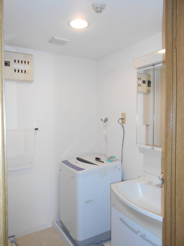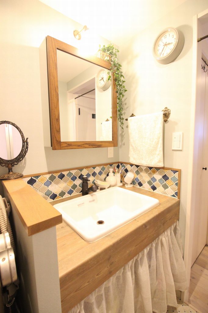 無垢フレームのミラーキャビネットと合わせて、木の質感が雰囲気を演出する洗面台になりました。