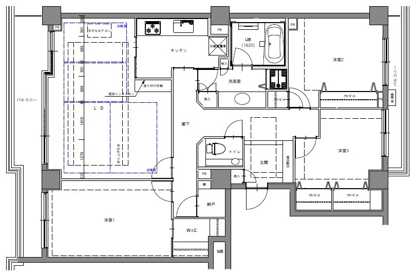 築浅でまだきれいなお住まいなのでLDの既存の床暖房に干渉しない、床の工事も最小限で済むプランを練り、間取り変更を行いました。