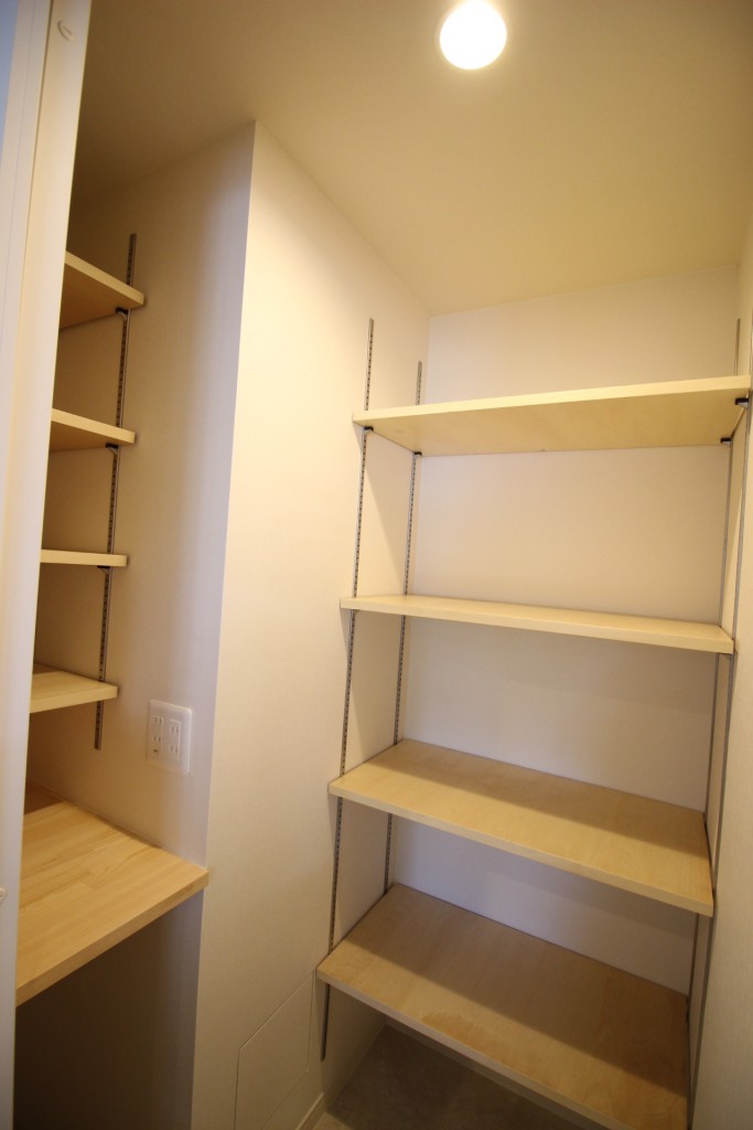 キッチン側にも頻繁に使用する乾物や調味料、食品ストックをしまえる便利な可動棚。