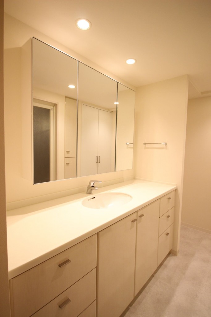 洗面台は、既存のまま残すことでコストダウンしつつ、一面鏡を収納力のある三面鏡に交換。